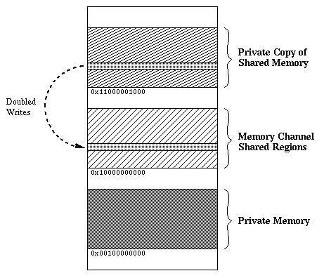 All modifications to shared memory are made using write instructions to the private copy of shared memory, see figure 1. These private writes are duplicated into the MC area. If the process is on the page's home node, the duplicate writes are kept local. If the process is not on the home node, the duplicate writes are transmitted through the Memory Channel to the MC receive region on the home node.