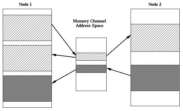 The Memory Channel (MC) network provides applications with a global address space using memory mapped transfer regions. A region can be mapped into a process's address space as either a transmit or a receive region. Data written into a transmit region will appear in any receive regions with the same global identifier. In the figure below, the lined region is mapped as both transmit and receive regions on node 1 and a receive region on node 2. The gray region is mapped as a receive region on node 1 and a transmit region on node 2.