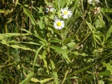 White, (occasionally pinkish), daisy-like flowers with yellow center, to 3/4",