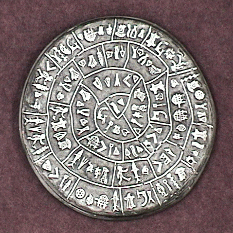 The Phaistos disk was discovered in 1908 in southern Crete, and apparently dates from about 1700 B.C. It is a two-sided, circular clay tablet, imprinted on both sides, with symbols in a spiral pattern. These symbols were impressed using a set of stamps, rather than being hand-engraved. This suggests a facility for large-scale production of printed material; however, no other samples of the script have ever been found, so the material available for decipherment is very limited. The disk contains a total of 242 distinct symbols, broken into 61 groups. Many of the symbols are pictures of clearly recognizable objects; however attempting to interpret these literally does not lead to any obvious decipherment of the disk. Speculation has thus arisen that the pictograms are somehow being used phonetically, perhaps in a manner similar to Egyption hieroglyphics. Another speculation is that the disk is an artifact having some ceremonial religious function, and does not represent a sample of a developed writing system. This would account for the lack of other exemplars. On the other hand, the use of stamps and implied mass-production capability suggests that other examples may yet be discovered.