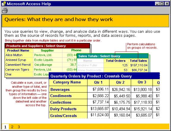 * View "Working with Queries > Queries: What they are and how they work" in MS Access 2000 help
